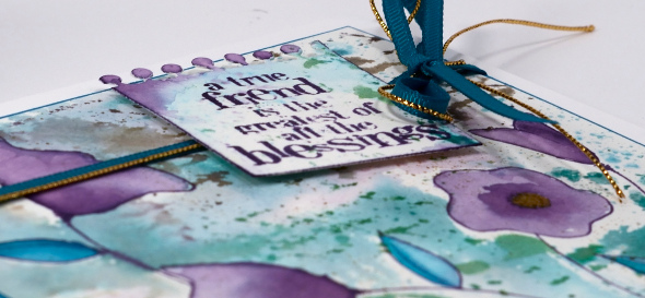Inks: Tumbled Glass, Milled Lavender, Evergreen Bough distress stains and Peacock Feather, Dusty Concord distress inks (Ranger)