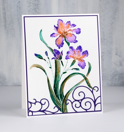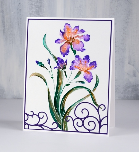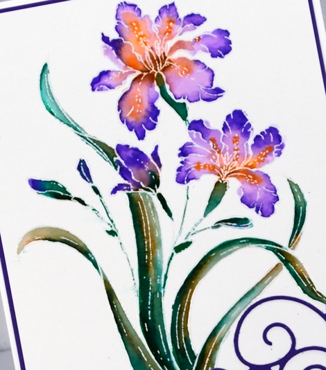 On the final panel I sprinkled the powders in the same areas and spritzed water liberally over the top so the colours filled the background as well as the embossed iris.