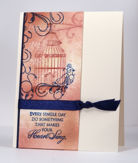 The panel I started creating was horizontal with the birdcage on the left and the sentiment on the right but when I’d finished stamping I didn’t like the layout. It was at this point I considered tossing it. Instead I sliced it in half and positioned one panel over the other, added a ribbon over the join and ended up with the layout you see here.
