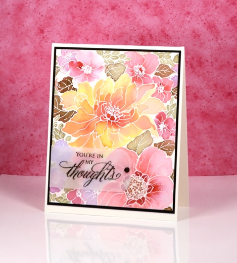 I had fun colouring this large scale floral design with brushos. I embossed the image on watercolour paper with silver pearl powder. I limited myself to four colours from the brusho range and I created different shades and values by mixing and diluting. The pink flowers are a mix of crimson and cobalt blue; some have little or no blue mixed in. The central flower is a mix of yellow and crimson. To make sure my greens blended in with the colours of the flowers I mixed some crimson with leaf green and created muted green-browns. In order not to loose too much of the panel behind a sentiment strip I embossed on vellum and added a half pearl over the adhesive. I didn’t have any black half pearls but a sharpie did the trick.