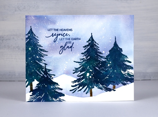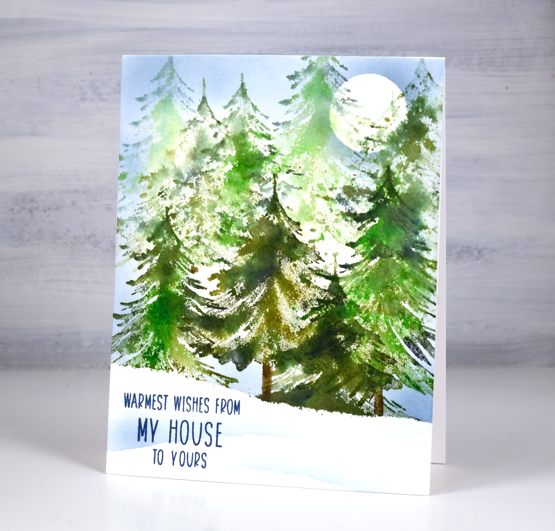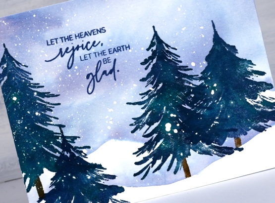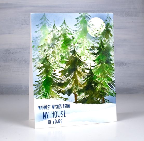 Last week I posted a card and video made with stamps from the Penny Black tannenbaum trio stamp set. I filled the scene with trees on the previous project making more of a forest. Today’s card features a different colour scheme and a painted sky.