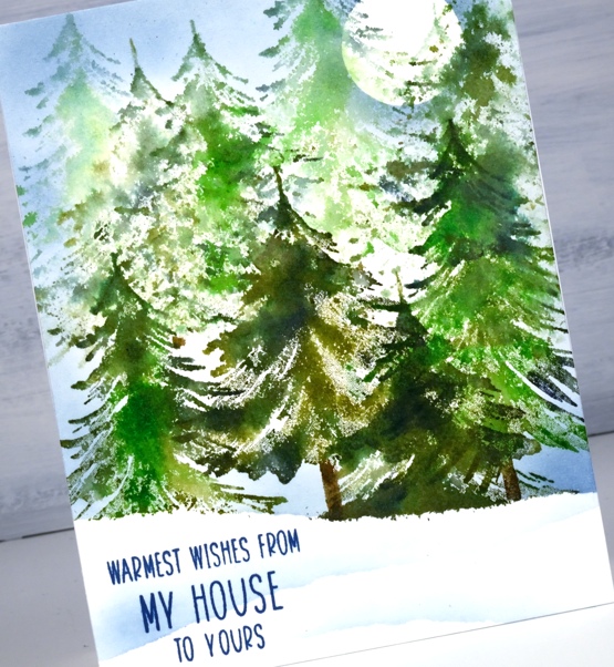 I worked on hot pressed watercolour paper with masking fluid splattered on it and began by stamping the small trees and horizon from the quietude stamp in iced spruce, forest moss and chipped sapphire. I blended over the trees with a paint brush but came back to them later to do more. I stamped the cozy cabin stamp next, forest moss and chipped sapphire on the trees, hickory smoke and black soot on the cabin. I remembered to colour inside the windows with a mustard seed marker before I got carried away with blending this time so it looks cozy inside. To add more trees behind the house I made a cabin post-it mask then stamped one of the tannenbaum trio stamps twice on the right hand side of the cabin.