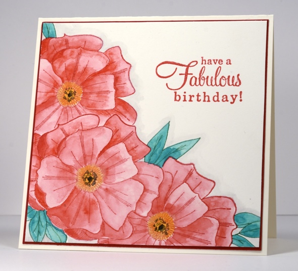 I began by stamping the bottom left flower then covered it with a mask I stamped and cut from masking paper. I then stamped the other two flowers and drew some leaves here and there. The flowers were stamped in Memento ink which dried fairly quickly. I used watercolour pencils and a waterbrush to add all the colour.