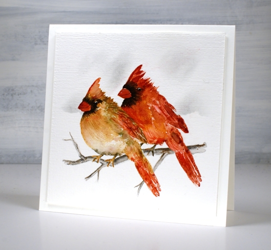 Trilling Trio from Penny Black arrived on the scene late last year and features three different birds. My card today uses just the cardinal stamp but I have coloured it two ways so as to have the male and the female on my panel.