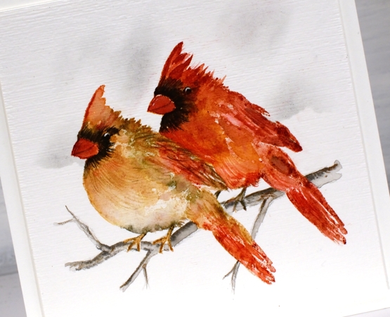 I worked with distress inks and watercolour pencils on hot pressed watercolour paper and I kept the panel in the stamp positioner so I could build the colours gradually. I stamped the female cardinal first in antique linen ink so it gave me a pale outline then I used tea dye, vintage photo and barn door inks to add colour. I spritzed the stamp lightly before stamping so the colours would blend but then did more blending with a paintbrush. I added black around the eye and beak both by stamping and by colouring directly on the panel. To add texture to the feathers I used sharpened watercolour pencils. I added the male cardinal behind using more barn door ink along with the tea dye and black soot inks.