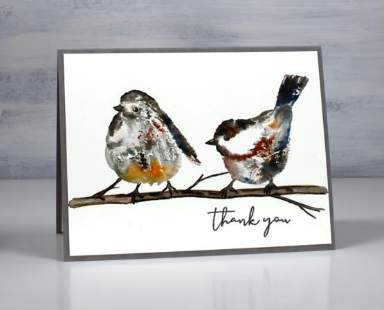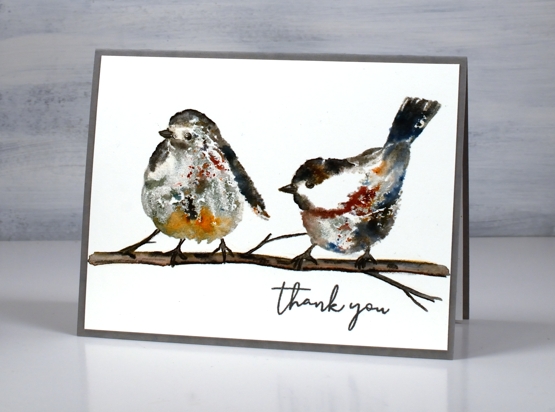On the left hand bird I used some black brusho as well as some sandstone on the lower front feathers. I blended the stamping a little with a paint brush but not much as I wanted to see the magic speckles where the brusho lands and dilutes. I drew and painted the little branch with watercolour pencils and some black soot ink then added the ‘thank you’ from PB ‘ever thanks’ set. I just realised as I stare at the bird on the left that it appears to have three legs! That’s a twig on the far left just in case you were wondering!!
