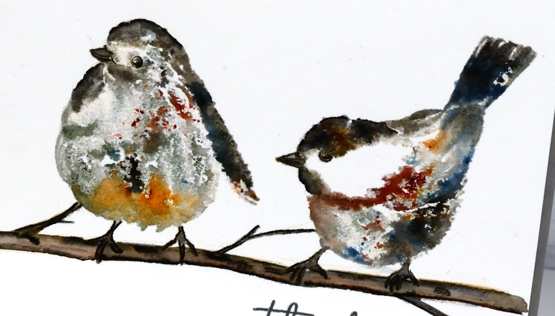 Once the birds were completed I drew a small branch with watercolour pencils, blended it and then used a blending brush and a torn piece of post-it note to add shadow in the background. I ran the panel through with the ‘subtle’ embossing folder from SU; it adds such nice canvas texture! There are two more delightful bird stamps in the set which I hope to feature soon!