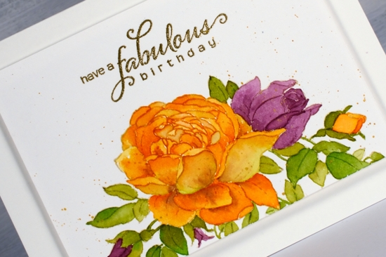 I splattered some gold paint from the gansai tambi starry set over the panel and added a sentiment in gold embossing powder to match. Rather than add a coloured mat I created a subtle ‘shadow mat’ by popping up the panel on a piece of foam. Thanks for dropping by today; let me know if you can see the mistake I made with the rose but decided to just ignore because I definitely did not want to start again!