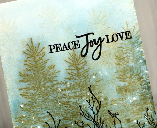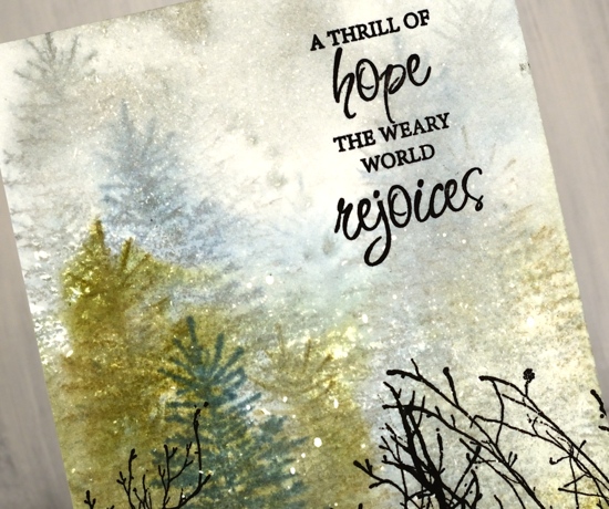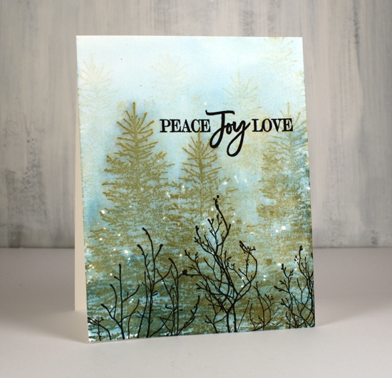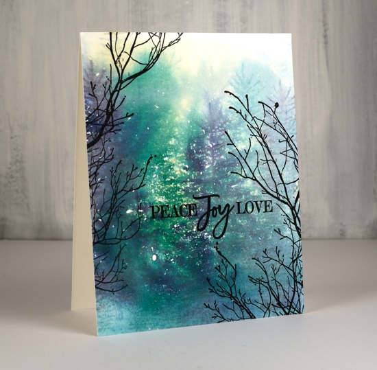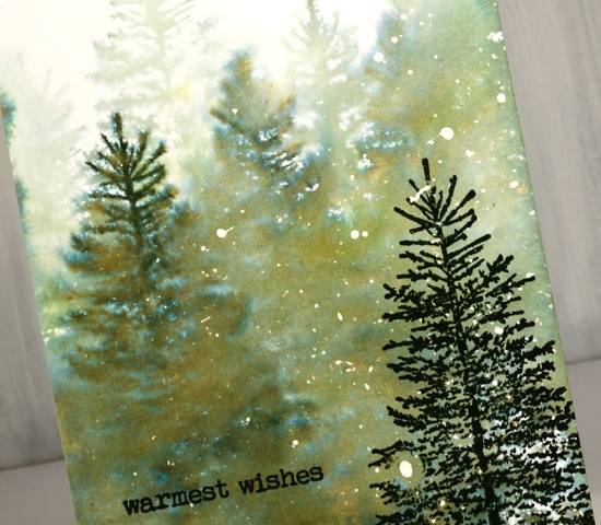 I used the same method for this card but used iced spruce, stormy sky and forest moss distress ink before spritzing with water. After the panel had dried a little but not totally I stamped a foreground tree in forest moss (or maybe a different ink, I’m not sure). After the panel was completely dry I added the fragile branches in black archival ink and in a stamp positioner so I could stamp a few times for a bold impression.