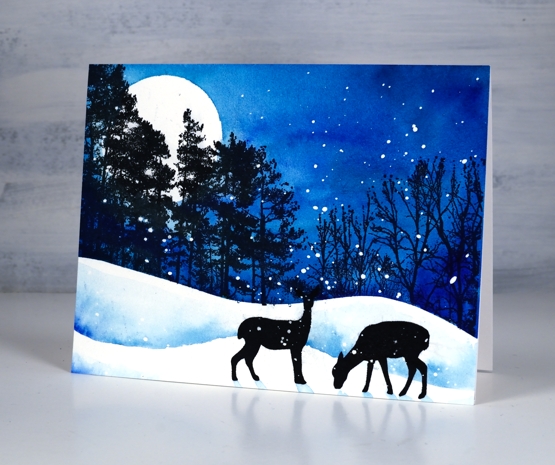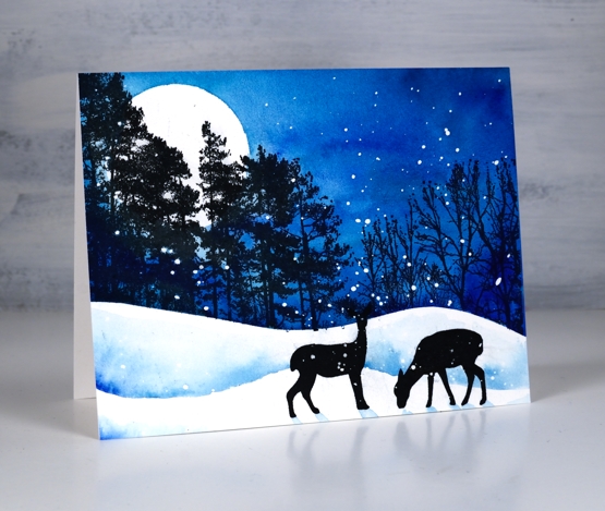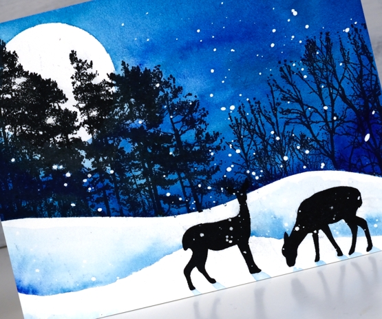 I worked on hot pressed watercolour paper and painted the sky and shadows with Sennelier watercolours. The trees and deer are stamped with the ever useful versafine clair nocturne ink. The video below shows my whole process.