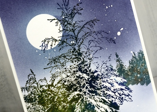 This beautiful ‘wintertide’ stamp from Penny Black is a scene in itself and the first time I stamped with it I didn’t add to it at all. This time I painted extra trees in the background for a bit more depth and atmosphere.