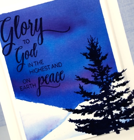 To create this little winter scene I stamped the tree in a mix of two greens and added water to blend the greens and add the shadow to the snow. To make the snowbank below the trees I partially inked the trees so the trunks weren’t stamped then painted some blue ink around the branches and as a sharp edge below the branches.