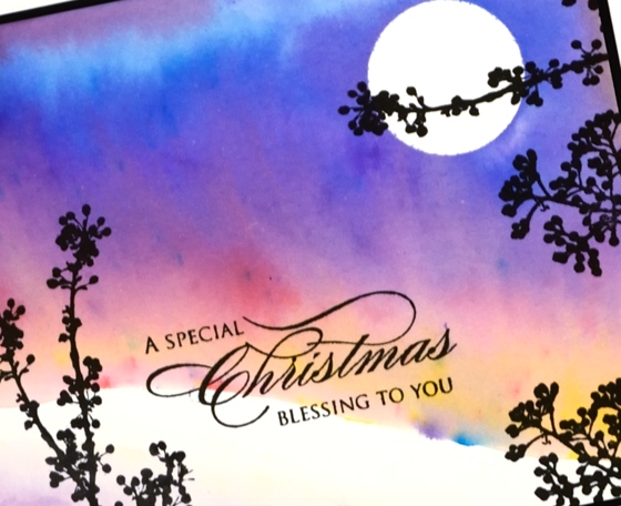 When I returned my panel was dry and all blended in the pretty pattern you see above – magic! I added the berry branches here and there, an extra shadow for a snow bank and a sentiment.