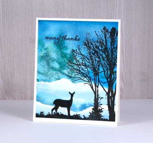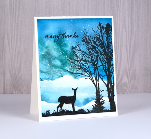 Posted: December 13, 2016 Filed under: Classes, Stamped Landscapes, Woodland Beauty | Tags: Classes, Penny Black stamps 15 CommentsI recently taught a card class where we created Christmas cards featuring the northern lights over snowy landscapes. Everyone’s scenes looked different as there was a variety of inks to choose from. Back in the planning stage for the class I created a few different scenes as I worked out what would work in a class setting. (I have to make sure I can reproduce my own techniques if I am going to have any chance of teaching them to others.)