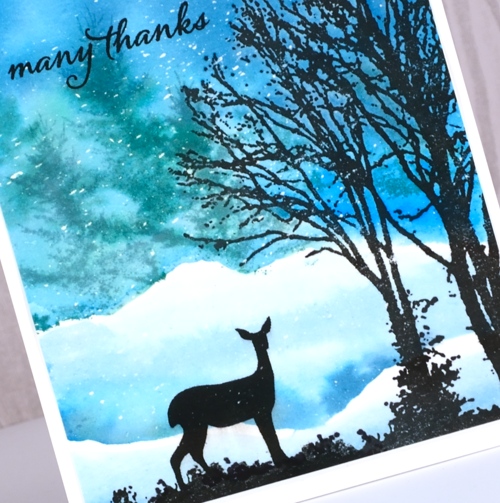 Posted: December 20, 2017 Filed under: Nature's Friend, snowy village, Stamped Landscapes, Woodland Beauty | Tags: Penny Black stamps, Ranger Distress inks, Ranger Distress stains 5 CommentsI’m a guest over at the Foiled Fox blog today; you know that is one of my favourite places to share my cards. With less than a week until Christmas I have switched to making thank you cards. This one combines several Penny Black stamps, one from this year and others from Christmasses past. All the snow falling is the effect created when painting over splattered masking fluid. After the painting has dried I rub off the masking to reveal little white dots – snow! The black stamping is done with pigment inks to preserve the sharp defined edges of the trees and deer. The soft tree shapes in the background are stamped in distress inks to enable blending and bleeding into the watercolour sky.