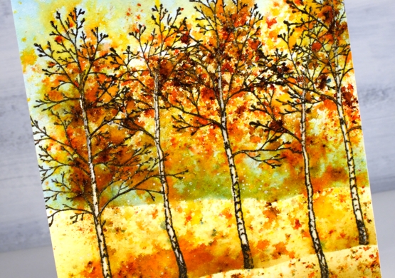 First I stamped the three trees in ‘fallen leaves’ versafine clair ink and embossed in clear powder on hot pressed watercolour paper. To preserve the white tree trunks I used a clear embossing marker to cover the length of each trunk and embossed in clear powder again. With distress inks and blending brushes I blended speckled egg ink in the sky area and fossilized amber and brushed corduroy on the ground. I used simple post-it note masks to suggest hills and horizon.