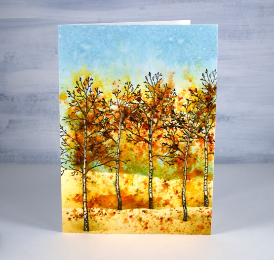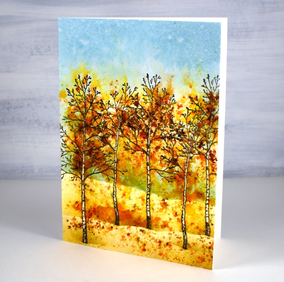 First I stamped the three trees in ‘fallen leaves’ versafine clair ink and embossed in clear powder on hot pressed watercolour paper. To preserve the white tree trunks I used a clear embossing marker to cover the length of each trunk and embossed in clear powder again. With distress inks and blending brushes I blended speckled egg ink in the sky area and fossilized amber and brushed corduroy on the ground. I used simple post-it note masks to suggest hills and horizon.