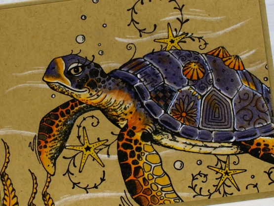 The turtle has also been on the blog before, in watercolour and pearlescent paint. As with the other animals she looks good in pencil on kraft. She has plenty of whimsy in her patchwork shell. Choosing dark blue for her shell was not so realistic but her underbody and fins were inspired by a photo I found.