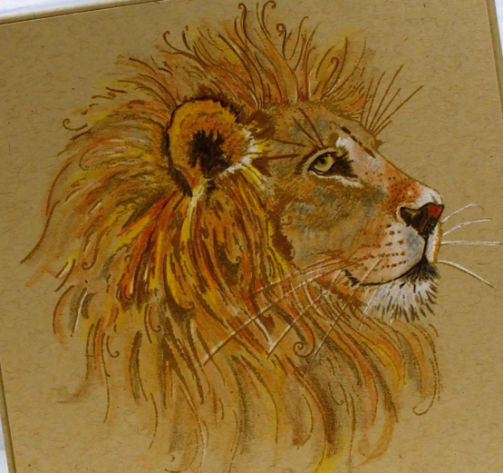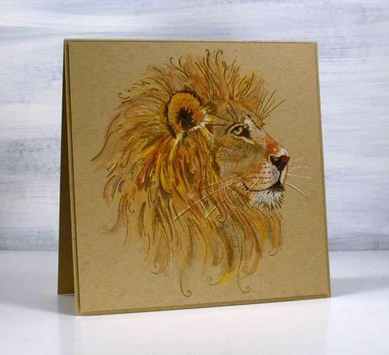 I don’t remember ever colouring a lion before so I had a reference photo in front of me to work out where the shadows were and where the colours of the fur changed. The stamp has a crown on the lion which I didn’t want for this card so I left it un-inked and filled the gap with more of his mane.