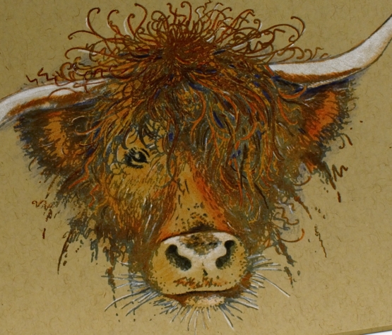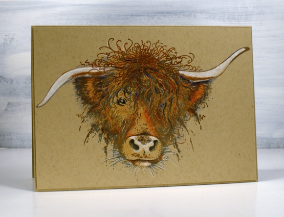 The highland cow is a beauty, no added whimsy but plenty of personality. She’s been on the blog before. I stamped the image with papertrey weathervane ink and rusty hinge distress then added colour with pencils (Faber Castell polychromos).