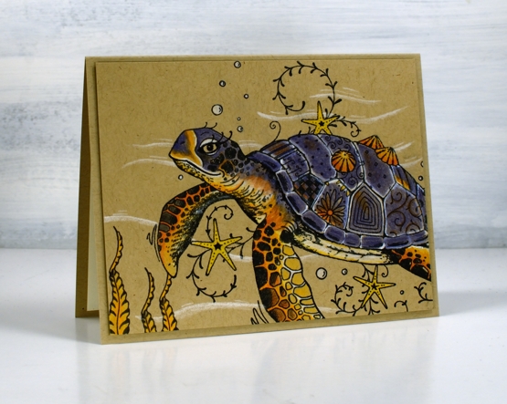 I don’t make many cards for children so I’m sometimes at a loss for the right theme. The whimsical and beautiful animal stamps from Pink Ink Designs have helped me out several times, and not just for children. This one, simply titled ‘whale’ from their nautical series is lovely to paint or colour. Last time I used it I coloured with Faber-Castell polychromos pencils on kraft cardstock.