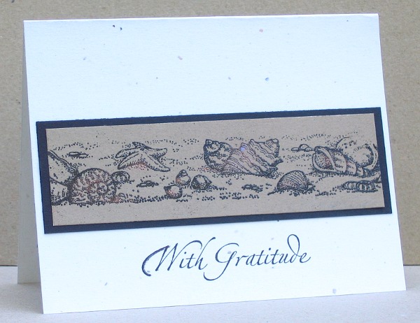 Posted: July 20, 2010 Filed under: CAS, Rollers Leave a commentLast week when I was playing with Kraft I switched from white to black embossing and had fun with that too. I pulled out some rollers that I haven’t used in very long time and inked them up with versamark and embossed in black. I decided that the dragonflies needed a little extra something and went in search of my Pearl Ex powders, another item that hasn’t seen the light of day in quite a while. The blue powder was exactly what I needed to add a little lift but then I decided to add a little bling as well. I also used a little copper Pearl Ex on the shells ever so lightly.