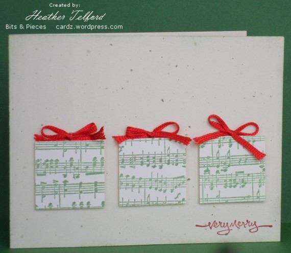 When I saw Colleen’s clever stack of presents I again saw an opportunity to use my music roller. I reproduced her card but without all her gorgeous embossing and layers (I was a bit lazy to add them). Then, because I was on a roll, I made another card with the gifts in a row. On all the cards the punched shapes are popped up on stampin’ dimensionals and on the two cards above the shapes are sponged around the edges too.