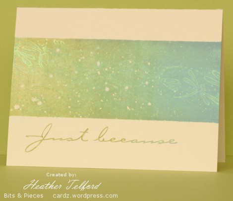 To make the top card I flicked around a bit of masking fluid first then rolled the dragonflies with versamark before brayering celery and bordering blue over the top of that. I shook pearl ex powder onto the coloured panel and it stuck to the versamark but also lightly to the rest of the area. You can see a bit of shimmer at either edge of the card but the string of shimmery dragonflies actually goes right across the card.