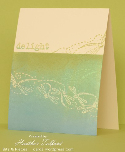 The card below was done in a similar order but I embossed a string of dragonflies first. After that I added a string in versamark and pearl ex and a few coming off onto the ivory cardbase.