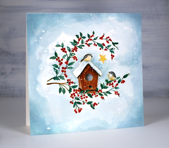 I stamped the large stamp in antique linen then did some no-line watercolour with Sennelier watercolour paints. While painting those little leaves and berries I did wonder if I should have chosen watercolour markers instead of paint brush and paints but I was already committed, so me and my very small paint brush kept on painting. When I finished painting all the elements I used speckled egg distress stain to darken the edges of the panel and frame the little scene. When I removed the masking fluid there were pretty little snowflakes over the whole panel.