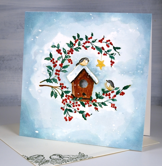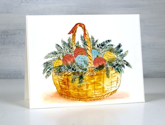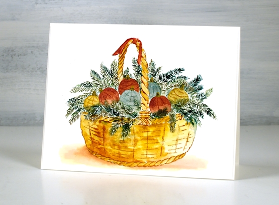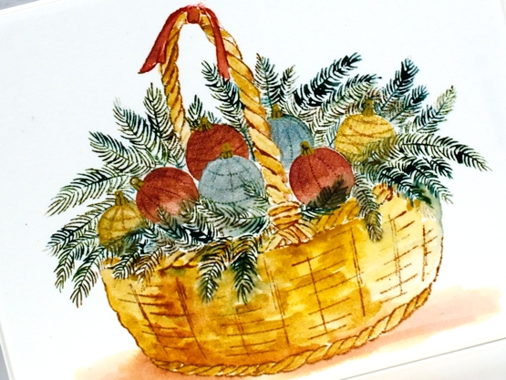 It is not clear in the photos but I used pearlescent paints to colour the balls so each one has a shimmer to it. The rest of the design is painted with a mix of distress inks and Sennelier watercolour paints. Once the painting was dry I added metallic tops to the Christmas balls with a gold gel pen. If you have this stamp or are planning to get it you might notice that there is a ribbon on the basket handle but no bow. The stamp features a bow but for the size of card I decided it was better to leave the bow loops unstamped.