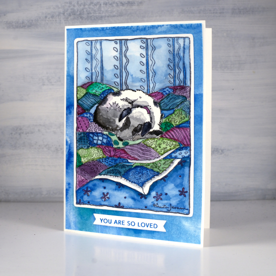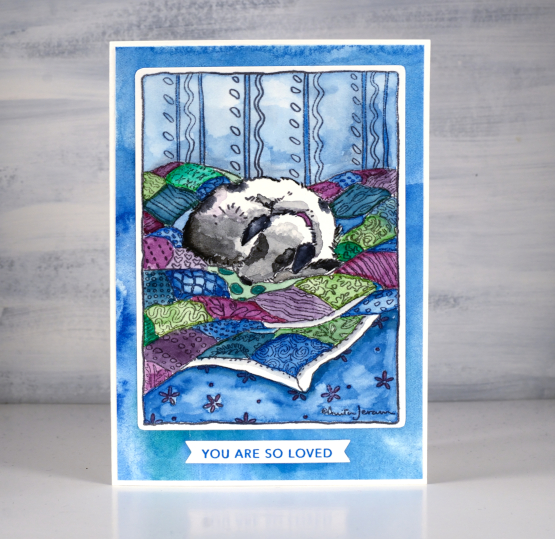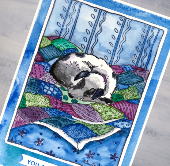 I stamped the image on hot pressed watercolour paper in versafine clair morning mist, a pigment ink which would not move when I added water and watercolour paint over the top. I used Sennelier watercolours for all the painting and to create a custom watercolour mat to frame the image also. I watched Sandy’s video more than once to help me paint the dog taking care to leave some areas bright white while the sections closer to the quilt were shadowy and grey.