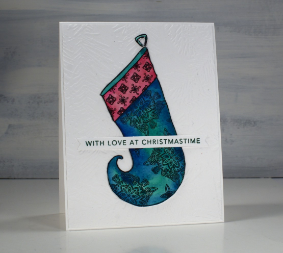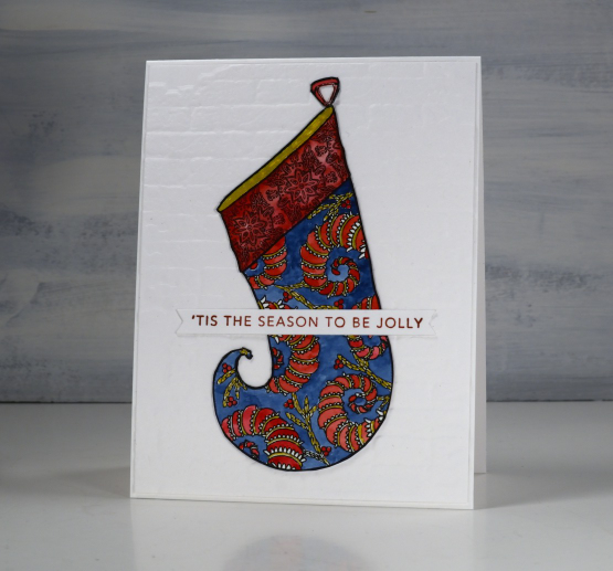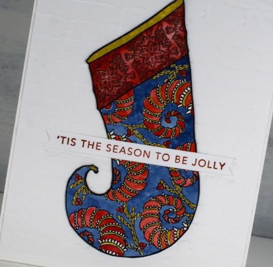 I attached both stockings to embossing folders, one with pine needles, the other bricks. I am very taken with embossing folders at present both for creating backgrounds and for making my own gel printing texture plates.