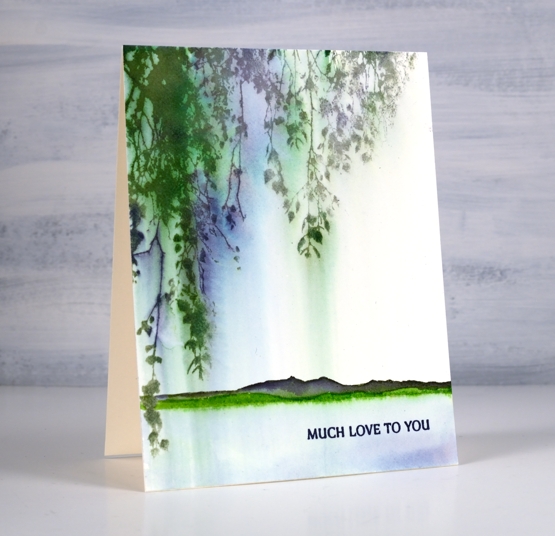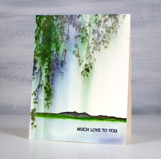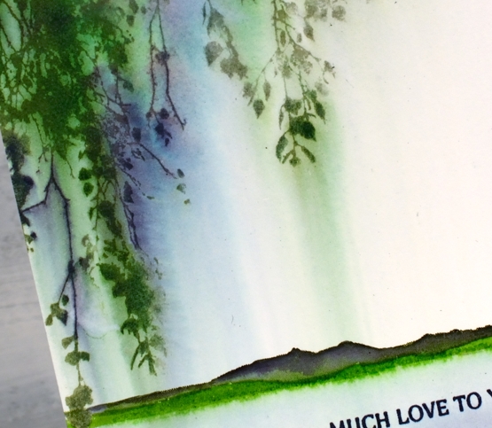 This card was very simple to make but I love the pretty blends and ‘weeping’ nature of the leaves. I inked the stamp with mowed lawn, chipped sapphire and iced spruce distress inks and stamped it on hot pressed watercolour paper. Soon after stamping I used a wide watercolour brush to paint water downwards over the stamping. The brush pulled ink from the stamping, blending and diluting it in the process.