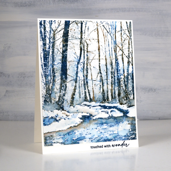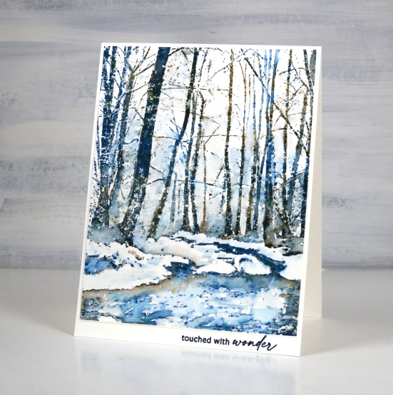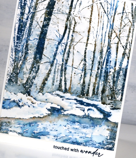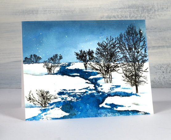 I love it when I find a stamp that looks like somewhere I’ve been. I couldn’t tell you exactly where this is but I have experienced scenery like this. I’ve said it before but winter here in the dark cold north is very beautiful. This gorgeous PB stamp is called ‘rivulet‘ and I used only two inks! I am going to let you guess the inks. I’ll update the links below in a few days but I’d really like to see your guesses. (hint: they are distress inks)