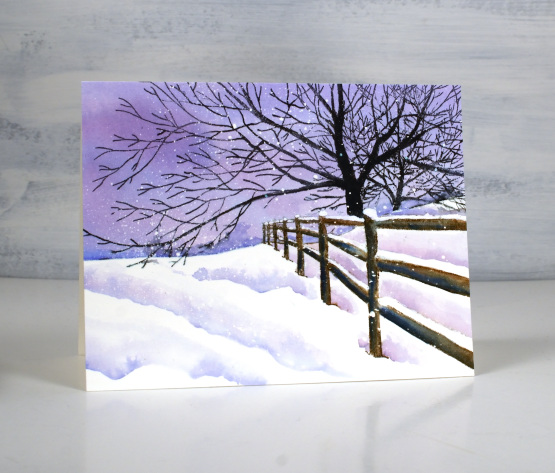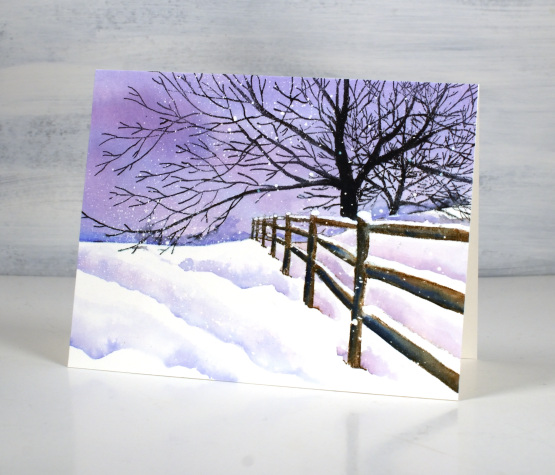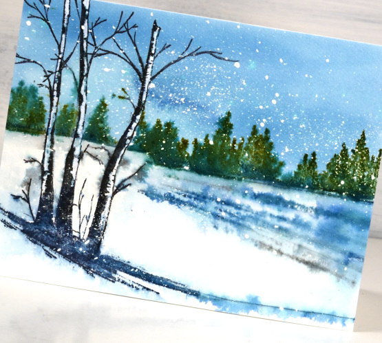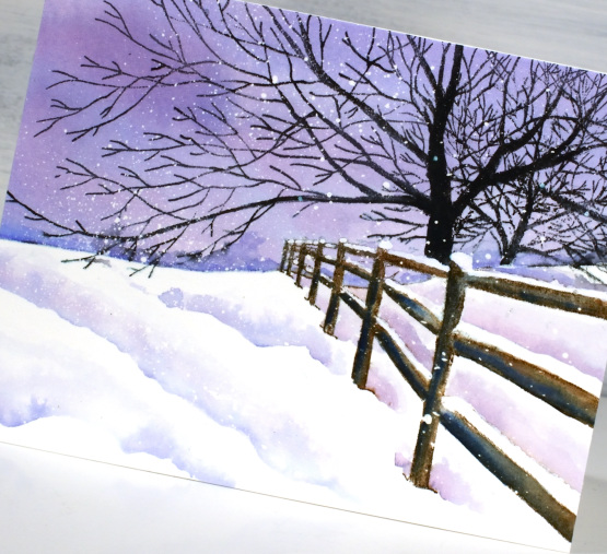 When painting shadows around snowy areas it is sometimes hard to keep all the white areas white; that is where a paint pen, gel pen or some white paint can come in handy for touching up at the end. You can even add paint splatter at the end rather than masking fluid at the beginning if you like.