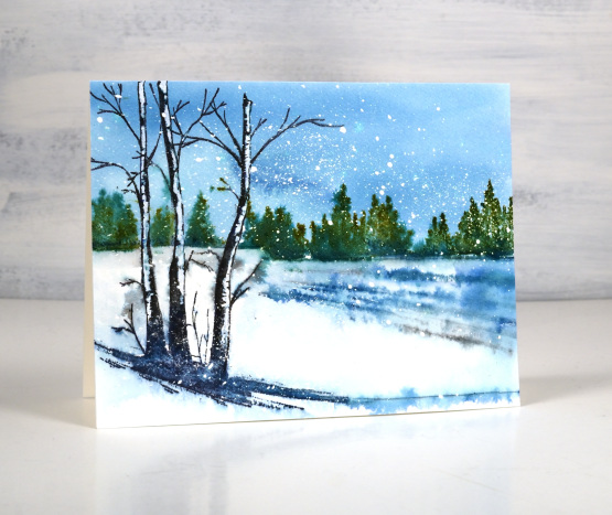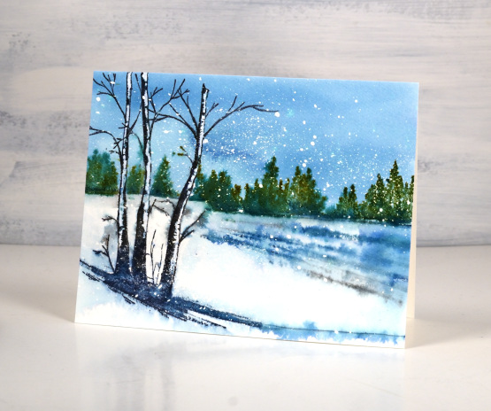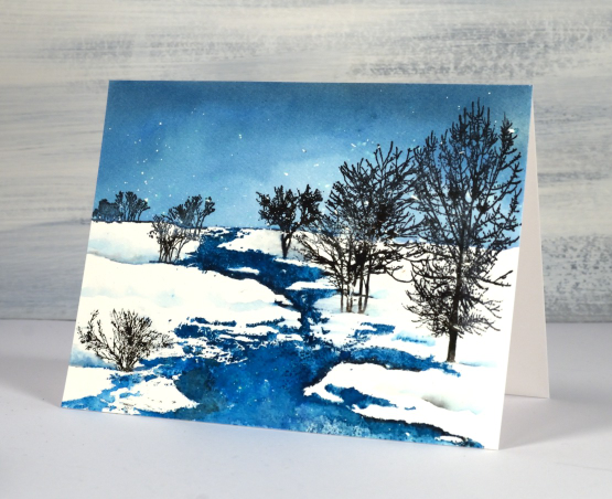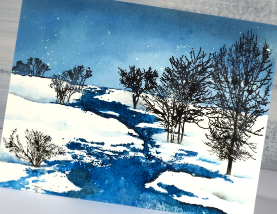 You can probably tell I started with splattered masking fluid on the watercolour panel. I tend to do a few panels at a time so they are ready later when I want to stamp a winter scene. If you don’t want to bother with masking fluid you can always splatter with white paint when you have finished your scene.