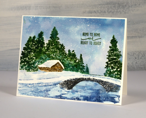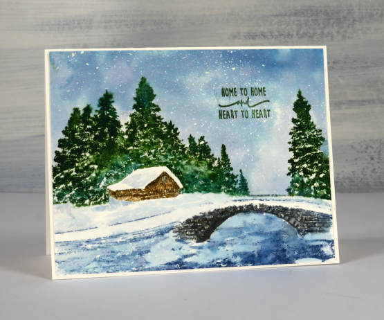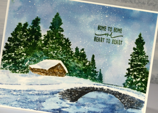 As usual I worked on hot pressed watercolour and kept it in a stamp positioning tool. The paper was splattered with masking fluid before I started, that’s how I ended up with all the little white dots of snow falling. I stamped the top half of the stamp first in pale green, but I should have chosen pale blue. I did this so I could see where the trees were and the top of the bridge. While the panel was securely in the stamp positioner I painted the sky with faded jeans distress ink making sure the ink came right down to the top of the bridge and past the tops of the trees. When the painted sky was almost dry I stamped the trees in rustic wilderness and pine needles inks. With a damp paintbrush I blended the inks making sure I left sections of the tree white to look snow covered. I moved onto the cabin which I stamped in vintage photo and black soot. The bridge is stamped in black soot and hickory smoke ink and blended with a paintbrush.