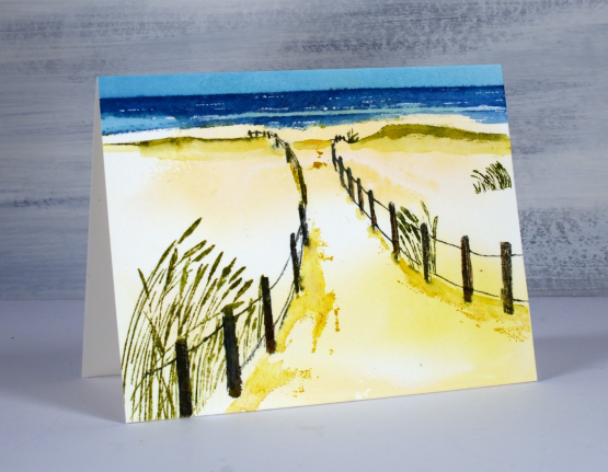 To create a sandy background I swiped a piece of hot pressed watercolour paper through some smooshed yellow inks. It gave an uneven coverage which I left to dry before stamping. Using a stamp positioner I stamped first the fence posts in grey and brown then inked and stamped the grasses with a couple of green markers. I stamped the sea in uncharted mariner(of course) then the shadows in the sand with fossilized amber.
