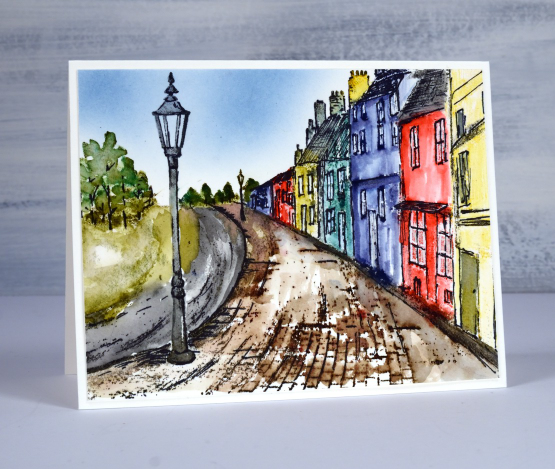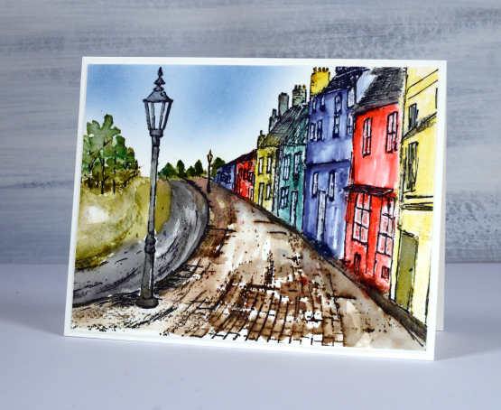 My approach was to use a stamp positioner and stamp first the cobblestone path, the trees, the lamp-post and then each house, all in distress inks. I then used a paintbrush and water to blend the colour in each stamped area. When the blended ink dried I stamped over the road and path with archival and amalgam inks to provide outlines. I was aiming for a sketched look so I used a permanent black marker to add outlines to all the houses as well. I fiddled back and forth between blending more distress inks and adding more outlines until I was happy with the image. To add sky I blended whatever blue ink was already in my blending brush! (looks like it could have been faded jeans but who knows?)