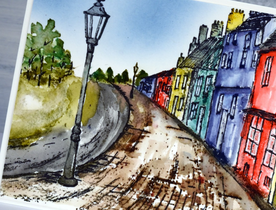 When I searched for a reference photo to guide my choice of colours my first search gave me a very similar English street, lovely but rather monochrome. I will try that approach next. Once I put Danish village street in the search I found something more colourful which ended up being the inspiration for this panel. As usual I worked on Fabriano hot pressed watercolour paper.
