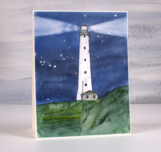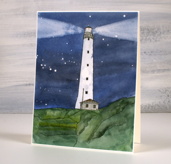 The lighthouse is called the Cape Wickham Lighthouse and it is on King Island in Australia. My daughter created the digital design from a photo but it wasn’t one of her photos; she’s never been there. The reference photo is from a slide my dad took in 1963 when our family lived on King Island. I was born there and at age 2 had my photo taken in front of the lighthouse. So you see there is input from three generations of my family in this card!