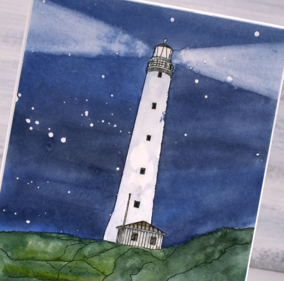 I printed the digital image on hot pressed watercolour paper, masked the lighthouse with a few strips of painter’s tape then splattered masking fluid over the sky. I painted the sky with Sennelier watercolours and while it was still damp painted removed paint with a damp brush to create the beams of light. Once the sky was dry I removed the tape so I could add some shadow to the lighthouse and paint the grass and hut. I removed the masking fluid to reveal the stars once everything was dry. (now I’m not sure that the Cape Wickham light shines out both ways like that but I used artistic license).