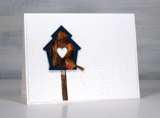 I die-cut the frames from deep red and petrol blue, blended ink on white die-cut birds then put together two birdhouses.