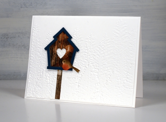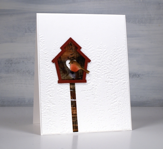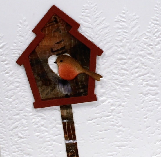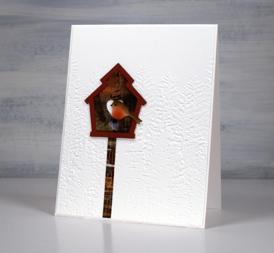 The large piece of ‘clean-up/practice’ paper provided me with unique patterned paper for the birdhouses. The embossed background was created with the ‘evergreen forest 3D folder’ from SU.