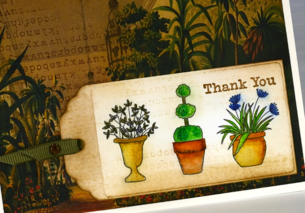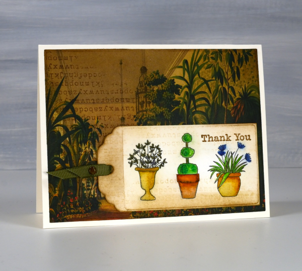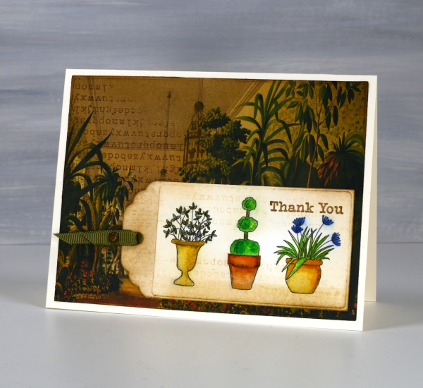 I’ve been making some vintage style collage cards lately (I’ll share them on the blog soon) so I decided to find a book page as background for my watercoloured tag. I blended vintage photo and antique linen inks around the background and tag and added some typewriter alphabet stamping on both. Unfortunately I stamped the alphabet upside down on my background but I continued with my card anyway! I like the pairing of old fashioned conservatory with modern little pots just for fun.