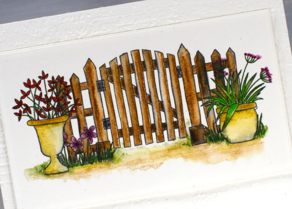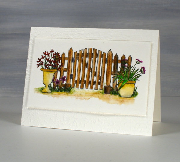 The gate design above I coloured with inktense watercolour pencils and blended the ink with water and a very fine brush. The ink from the printer did bleed a bit so you can some some grey tones here and there. Because I used very little water I was able to keep the bleeding to a minimum. I received the lovely ‘exposed brick‘ embossing folder for my birthday from a couple of friends who know just what I like. It seemed an appropriate background for the slightly aged garden gate.