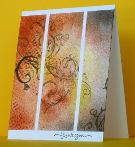 To create this card I cut thin strips from the sticky end of a post-it note and laid them on the card before placing more post-it notes on the top and bottom. I built up the colours by sponging Chocolate chip, Really Rust and Summer sun ink. For a little texture I used the dotted stamp from Extreme Elemnts. I also added tiny dots with markers and stamped the flourish several times to complete the card.