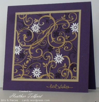 Posted: July 4, 2010 | Author: Heather | Filed under: Baroque Motifs, CAS | 1 CommentInspiration can come from just about anywhere. This time it came from the backdrop of a concert I was watching last night. The overall colour scheme was antique browns and the flourishes extended across the backdrop as the song progressed. My aim was to produce something with the shabby antique look. I have also enjoyed viewing Susan’s One Layer Wednesday challenges over at Simplicity although I haven’t had a chance to participate yet. The outcome was a one layer, shabby card with some masking as well.