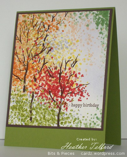 Posted: August 27, 2010 Filed under: Branch Out, Stamped Landscapes 10 CommentsAlthough we are still in summer, there are definitely signs of autumn already. So, I think this card for a friend having a birthday today will still be appropriate. The nights are cooler and the colours are beginning to change. This one is another for the Friends of Speedy the Cat’s Fall/Harvest Challenge. Do you like my new watermark? I carefully followed the tutorial on Vicki Dutcher’s blog and there it is. My husband did show me how to do it a few years ago but as I didn’t go over it straight away I did not remember the process.